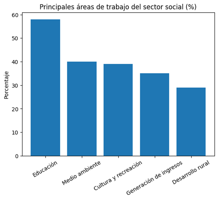 | Las organizaciones sociales trabajan principalmente en educación, desarrollo comunitario, generación de ingresos y protección del medio ambiente, lo que refleja una visión integral del desarrollo. |